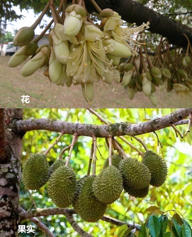 榴莲(Durio zibethinus)锦葵科榴莲属,常绿乔木。原产印度尼西亚,是典型的热带水果。榴莲的花为聚伞花序,黄白色的花,簇拥在一起开放,每序多达二三十朵花,全树有上万朵花?;ㄐ缓螅憧冀峁?,此时的小榴莲像一颗颗长刺的枣,但大半部分果实都无法成熟,很快就会脱落,从开花到结果,最后果实完全成熟,数量越来越少。