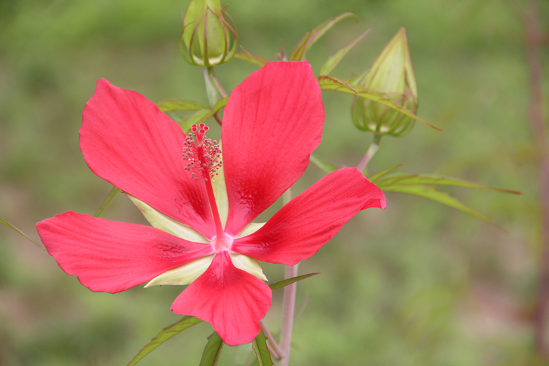 红秋葵(Hibiscus coccineus)又名红葵、槭叶秋葵,锦葵科木槿属,多年生直立草本。原产美国东南部。株高可达1-3米左右;茎带白霜、无毛,半木质化;叶掌状5裂,裂片呈狭披针形,边缘有不规则的锯齿;红秋葵花大而艳丽,花单生于上部枝的叶腋上,深红色的花朵在绿色枝桠的衬托下显得格外娇艳。入冬后地上部分即枯萎,次年春季萌发新枝条。