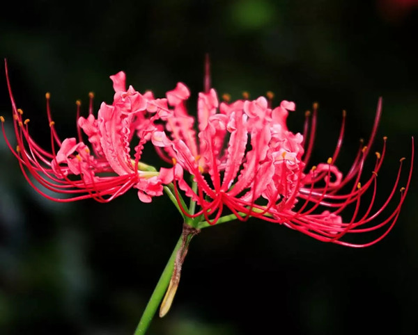 石蒜开花的时候,会突然从土里冒出火红色花朵,那窄窄的花瓣带着皱波向后翻卷着,簇拥成一只镂空般的灯笼,一丝丝晶莹细长的花蕊从花瓣的中心迸射出来,宛若尽情盛放的烟花。虽然没有绿叶的衬托,却兀自舒展着纤盈的花瓣,静静地伫立在草丛中。关于彼岸花的传说都很凄美,甚至被认为是开在黄泉之路的花,染着一种死亡和分离的色彩,很多人都把它当做不祥之物。这或许与其的生长习性分不开。彼岸花喜欢长在阴森潮湿的地方,多是在荒芜的田间小道和墓地里。