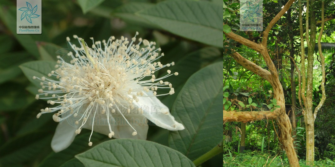 番石榴这种原产热带的果树并不像很多热带植物那么娇气,它们甚至能忍受-4℃的低温,并且能一生都生活在花盆之中。更难能可贵的是,番石榴的挂果年限超长,从栽种后两年就能挂果,一直到树龄40年的时候还能贡献果实。我们常常见到番石榴的果实,殊不知番石榴的花颜值也很高。番石榴是桃金娘科的,保留着桃金娘科植物雄蕊繁多的特点。几枚白色的花瓣犹如某种绢纸折成的一般,上面是无数细长的白色雄蕊,正中央只有一枚更加长的雌蕊。被风一吹,那些雄蕊颤颤巍巍的十分惹人怜爱。番石榴的树皮十分光滑,而且老的树皮常常脱落。所以看上去总是布满灰色和褐色的斑块。其叶片深绿且粗糙,叶脉很深。所以,即便番石榴没开花,也是比较容易辨认的。