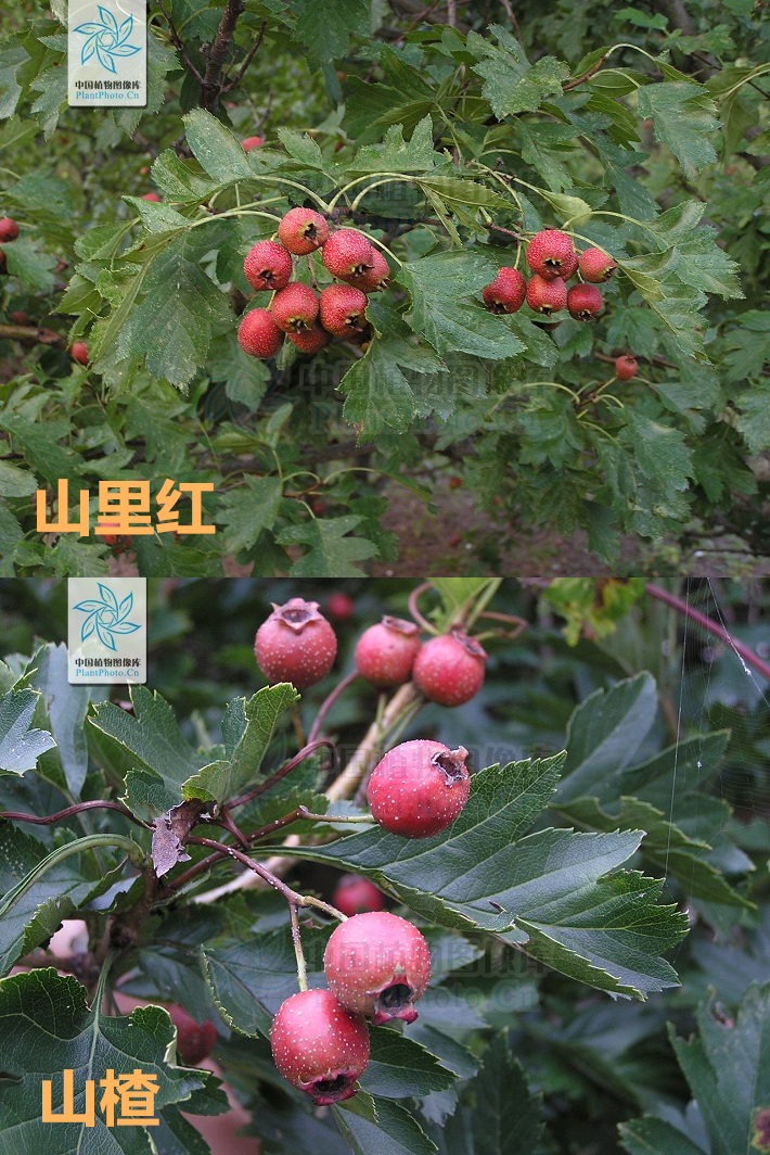 据《中国植物志》记载,蔷薇科山楂属植物广泛分布于北半球,北美种类很多,中国约产17种。平时被我们当做水果吃的主要是山楂Crataegus pinnatifida 的一个栽培变种大山楂C.pinnatifidavar.major,也叫红果或者山里红。从外貌上看,二者有显著区别:山里红的果实要比山楂大,直径可以达到2.5厘米,而山楂果实的直径不超过1.5厘米;山里红的叶片也要比山楂大,但叶片边缘的撕裂程度不如山楂。因为山里红的果实比较大,所以常常用来鲜食或者制作冰糖葫芦;而山楂的果实比较小,卖相不如山里红,因此,常常用来加工成果酱、果糕和果丹皮。