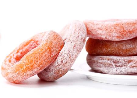 柿子含糖量较高,果肉中含有丰富的蔗糖、葡萄糖、果糖、晾干的柿饼外部会有一层白色的“柿霜”,这并不是淀粉,而是柿子内部渗出的葡萄糖凝结成的晶体。
