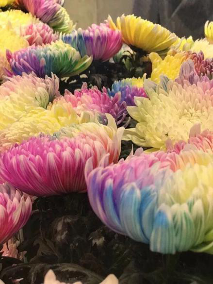 七彩菊,从外表看就像一朵朵七彩的祥云,单朵花上就汇集了赤、橙、黄、绿、青、蓝、紫七种色彩,七彩菊艳丽的颜色,寓意着人生的绚烂和生命的蓬勃,因此也有人称之为“幸福菊”。令人如梦似幻的美丽甚至让人怀疑起了七彩菊的身份是真是假。七彩菊并非是用普通的花朵染色而成,而是采用生物炫彩素,通过控制温度、水分、光照、pH等因素,使菊花茎部对色素进行吸收,将多种色彩均匀地呈现在花瓣上。如将它养于清水中,比一般鲜花保鲜期要长2至3周。