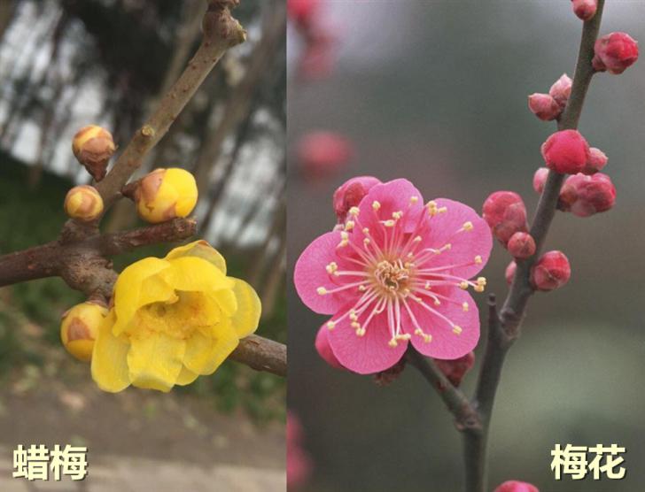 蜡梅因名字里有一个“梅”字,所以很多人将蜡梅当作梅花的一种。实际上蜡梅与梅花两者在植物学上既不同科,也不同属。蜡梅为蜡梅科蜡梅属、落叶灌木植物,而梅花则是蔷薇科杏属、小乔木植物,只因同是一个“梅”字,香味又略有相似处,因此往往被人误认。其实二者完全不同:1、蜡梅叶对生,全缘无齿,而梅花叶互生,叶缘有细锐锯齿;2、蜡梅花以黄色为主,而梅花则有白、粉、深红、紫红等颜色,甚至还有双色,唯独没有黄色;3、蜡梅花期一般要比梅花早,北方地区蜡梅花期一般在11月至翌年3月,梅花花期一般在3月至5月。只要记住以上这几点不同,二者还是很容易区分的。当然,它们还有许多其它不同之处,大家有时间的话可以去细细观察一番。