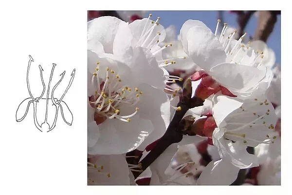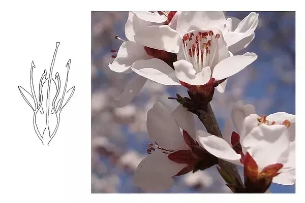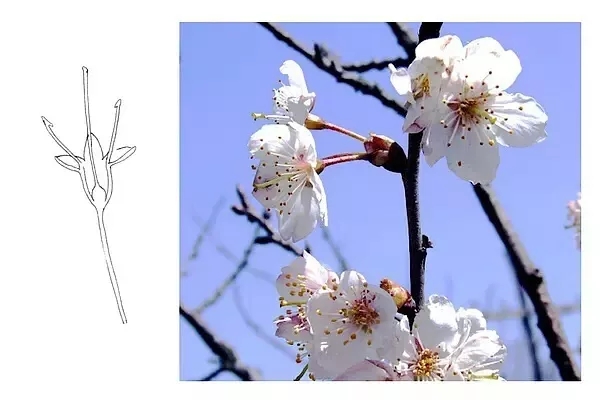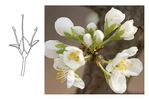 李属和杏、桃两属在花的形态上很相似,但是李属的“腿”比它们长,长着一个长花梗。花朵常有芳香,通常两至三朵并生,交互着生在枝条上。
