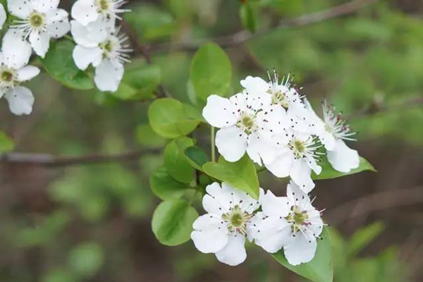 梨花,落叶乔木,叶圆如大叶杨,干有粗皮外护,枝撑如伞。最显著特点是花药呈紫红色?;ㄆ谠荚?月,一般花叶同放,多花簇生,具有香气,花为白色的,花托以绿为基础,叶子较大。