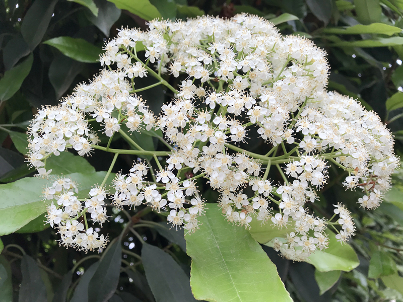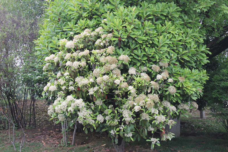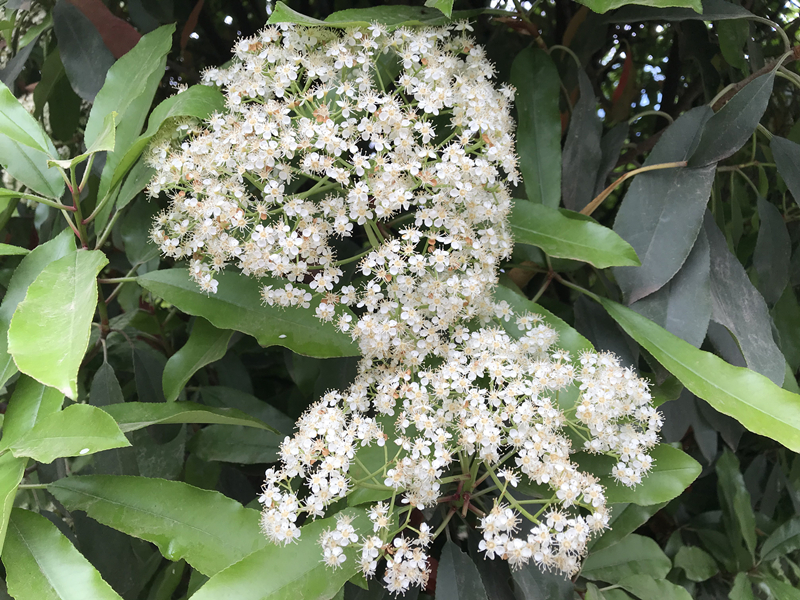 石楠(Photinia serratifolia)蔷薇科石楠属,常绿灌木或小乔木。石楠最早写作“石南”,按李时珍的说法,因为它“生於石间向阳之处,故名石南”。(其实石楠属植物最常分布的地区是山坡灌丛和杂木林,因为周围有其他大乔木,所以石楠的野生环境反而是向阴的居多。)但后人觉得“石南”没有草木之名常有的偏旁部首,于是便改为“石楠”。其叶片常绿,新生叶片鲜嫩嫣红,明代田汝成《西湖游览志馀》记载:“立秋之日,男女咸戴楸叶,以应时序?;蛞允煲都艨袒ò?,扑插鬓边?!笔杭究ǎㄋ湫∪词志?,上百朵的小白花密密麻麻地挨在一起,迎着春光,可爱至极。秋天结小梨果,熟时红色,后呈褐紫,缀满枝头,从远处看会误以为开了满树红花,甚是壮观。
