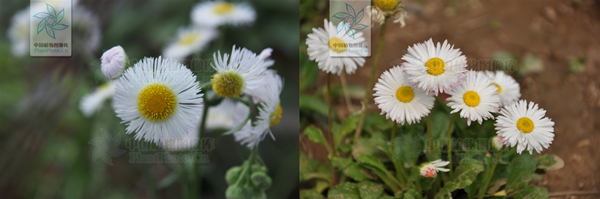 有很多朋友多年来一直误将一年蓬当成雏菊(Bellis perennis)。虽然二者确实是近亲,同为菊科,不过一年蓬是飞蓬属,雏菊是雏菊属。仔细观察可以看出,一年蓬的花朵较小,茎上有分支,每个分支有数朵小花,我们称这种花序为聚伞花序;而雏菊花个头较矮,花朵相对大些,每个茎上就一朵花,属于单生花序。此外,一年蓬靠近根部的叶片边缘都带有钝锯齿,雏菊则没有。