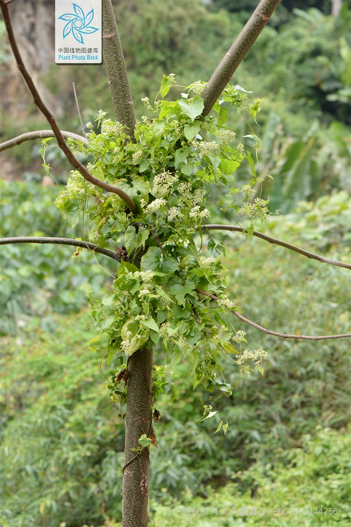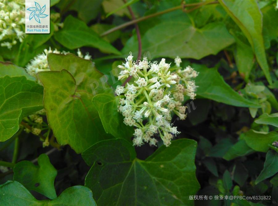 微甘菊(Mikania micrantha)菊科假泽兰属、多年生藤本植物。原产于中南美洲。茎细长,匍匐或攀援,多分枝;叶对生,三角状卵形,渐尖,具深凹刻,近全缘至粗波状齿;头状花序,每个头状花序由4朵管状小花构成,小花白色,稍有香味。