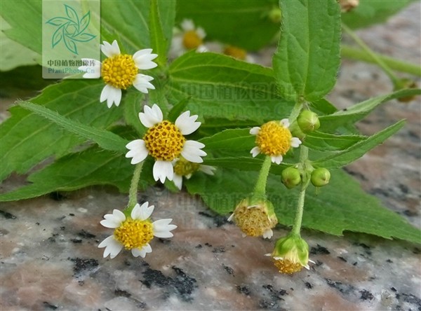 牛膝菊(Galinsoga parviflora)又名铜锤草、珍珠草、向阳花、辣子草。菊科牛膝菊属,一年生草本植物。原产南美洲。牛膝菊的株高10-80cm,整株看起来纤细柔弱,叶子和茎秆上有毛,叶对生,卵形或长椭圆状卵形。它的花儿小巧淡雅,需要低头仔细寻觅才能看清楚。金黄色的花心(管状花)被4-5朵白色的舌状花围绕着,舌片先端三裂,像五把白色塑料小叉子插在芒果布丁上,甚是可爱。