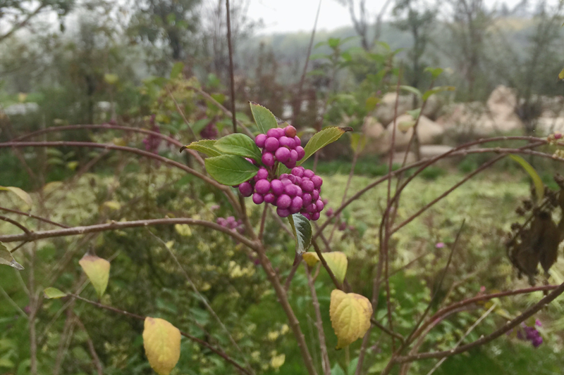 现在园区内紫珠的果实早已挂满枝头,十几二十个小果子组成聚伞状果序,果序包裹着枝节,满满当当的一整根枝条。远远看去,仿佛一座喷洒紫色糖果的喷泉。这些一颗颗鲜艳透亮、玲珑如珠的紫色小果子,在萧瑟的季节里演绎着惊心动魄的美。