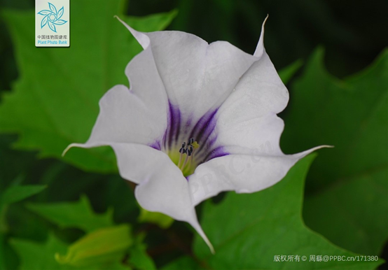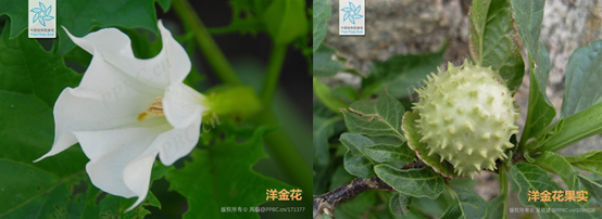 曼陀罗(Datura stramonium)茄科曼陀罗属,草本或半灌木状。原产于墨西哥。曼陀罗之名源自于梵语的Mandala音译,是圆的意思,是指神圣的圆轮、轴心。在中世纪欧洲,曼陀罗被称为“天使的号角”,这也足以说明它的毒性,那是死亡的呼唤。在中国,据说蒙汗药的原材料之一就是曼陀罗,以及华佗做手术时所用的麻药“麻沸散”中也有曼陀罗。曼陀罗花白色,呈漏斗状,直立向上,形状好似一朵旋状的巨型牵?;?,但是它和牵?;ú⒚挥腥魏窝倒叵?。曼陀罗果实表面遍布锋利的小刺,果实刚开始是绿色的,成熟后为淡黄色,自然开裂,露出黑色的种子。