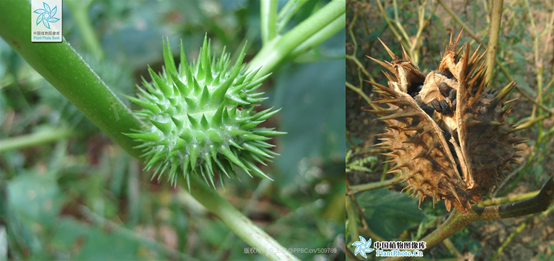 据《中国植物志》记载,曼陀罗属植物全球约16种,多数分布于热带和亚热带地区,少数分布于温带。我国3种,南北各省(区)分布,野生或栽培。最常见的就是曼陀罗(Datura stramonium),其生命力十分顽强,在什么地方都能生长。另外两个是洋金花(Datura metel)和毛曼陀罗(Datura inoxia)。比较常见的洋金花是它的重瓣园艺种,果实表面的刺短而粗;毛曼陀罗果实的刺,细密得像毛一样。而该属的植物也是提取莨菪碱和东莨菪碱的资源植物。