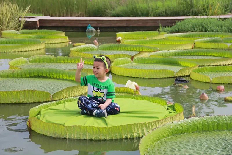 王莲与荷花、睡莲并称为三大水生花卉,是西安植物园最吸引眼球和上镜率最高的水生花卉。其叶片硕大如盘,直径通常在2米之上,最大可承重约70公斤(曾有实验者用铺沙试验测试发现)。我园开展的“萌娃坐王莲”的科普体验活动,为了安全起见,对其叶片施加的重量要求不超过30公斤,而且乘坐王莲叶并不是直接踩上去,而是需要放一块轻质的垫板,起到分散压力、平衡叶片受力范围的作用。毕竟它只是一片叶子,一旦踩破漏水也会有“沉船”风险。