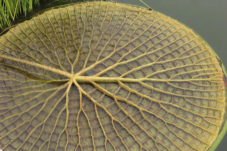 只要将王莲的叶子整个翻过来,你就会发现其叶子的背面生长着粗约筷子般的叶脉,呈板状隆起。粗大的叶脉构成“骨架”,“骨架”之间还有镰刀形的横隔相连。这种环向和纵向交错的叶脉结构极其坚固,就像大铁桥的梁架支撑着整个叶片。同时王莲的叶脉内有很多大的空腔,腔内充满空气,使得叶片可以浮在水面。另外,王莲的叶子背面及叶柄上的小刺,是为了想让那些来啃食它的水生动物无处下嘴,以此来保护自己。