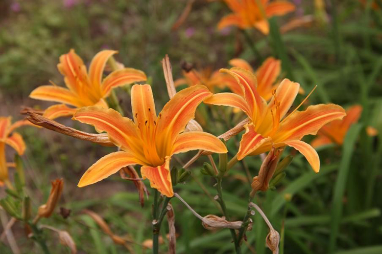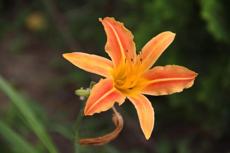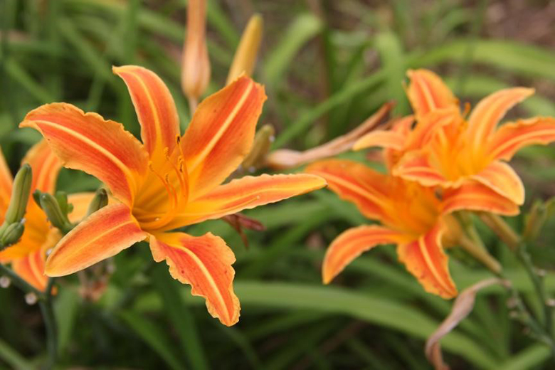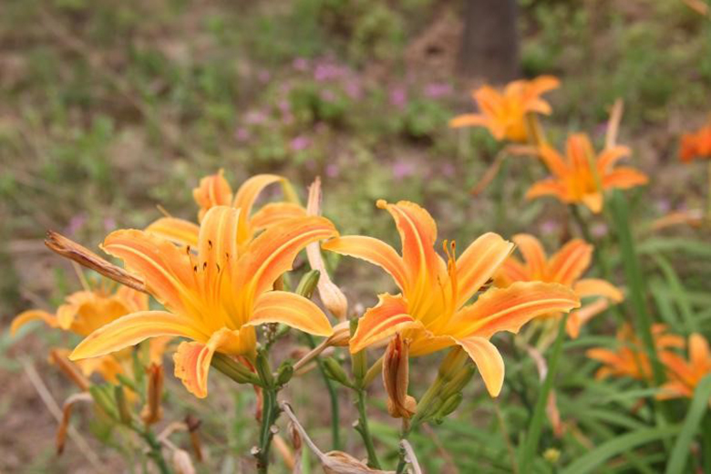 萱草(Hemerocallis fulva)阿?;?、萱草属。根近肉质,中下部有纺锤状膨大、叶较宽;细长的枝顶端开出橘红或橘黄色的花,内花被裂片下部一般有个明显的V字形斑纹,无香味。萱草的花呈漏斗状,花开一天便会枯萎,因而英文名叫Daylily,取其花开一日之意,加之其花形与百合相似,也被称为「一日百合」。虽然它的花只开一天,但是胜在花苞数多,可日复日开。