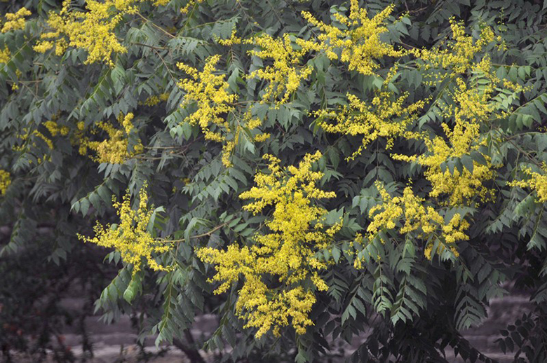 春天,栾树红色的嫩叶显得非常可爱。初夏时节,栾树枝叶愈加繁茂,黄色的花朵开始逐渐绽放,最后满树金黄,特别耀眼;近距离观察栾树花,你会发现,4枚黄色的小花瓣开在花的一边,花蕊纤长,花瓣基部有鳞片,这些鳞片在花初开的时候是黄色,逐渐变为橙红色。