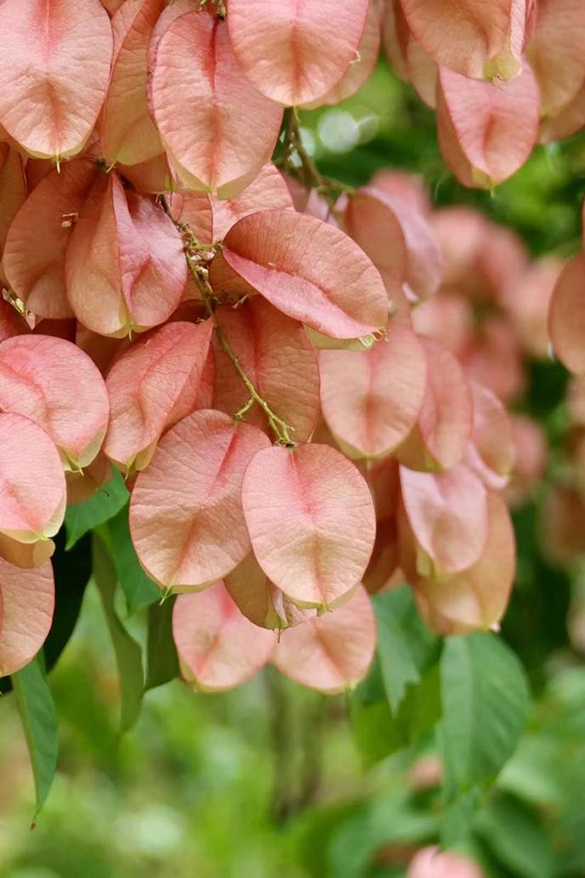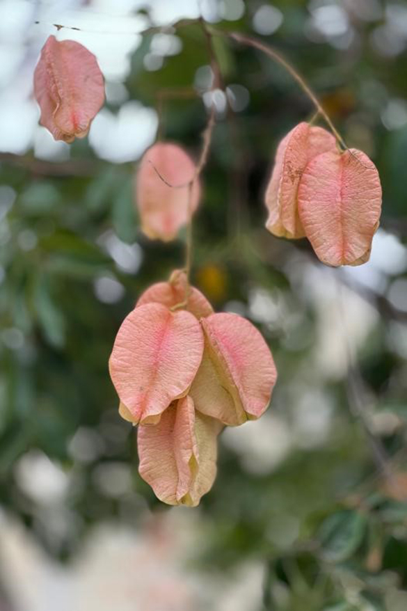 入秋之后,花朵落下,果实挂满枝头。栾树的果实在植物学上叫蒴果,三棱形的蒴果(像只有3棱的小号杨桃),三片膜质外壳包裹着几颗种子,成熟时果实呈红褐色或橘红色,远远看去宛如一大串、一大串的小灯笼挂在枝头,故而又被称为“灯笼树”。