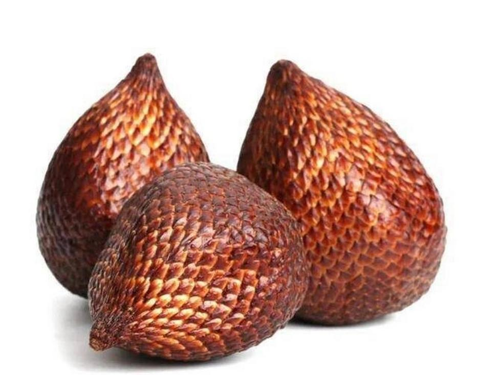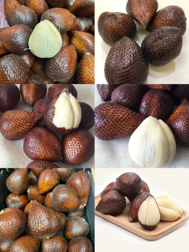 蛇皮果(Salacca zalacca)又名沙叻(lè),属于棕榈科蛇皮果属植物。蛇皮果的大小和无花果类似,下圆上尖,果实皮薄,外果皮上覆盖着覆瓦状反折的鳞片,鳞片顶尖光滑或呈刺状尖,顺鳞摸手感丝滑,这层皮不止看着像“蛇皮”,触感也很像。“蛇皮果”这个名字也因此而来。剥开其外皮,会出现和山竹有些相似的果肉(实际上是肉质种皮),味道酸甜,口感脆脆,果肉里面是坚硬的棕色种子,形似板栗,不能食用。