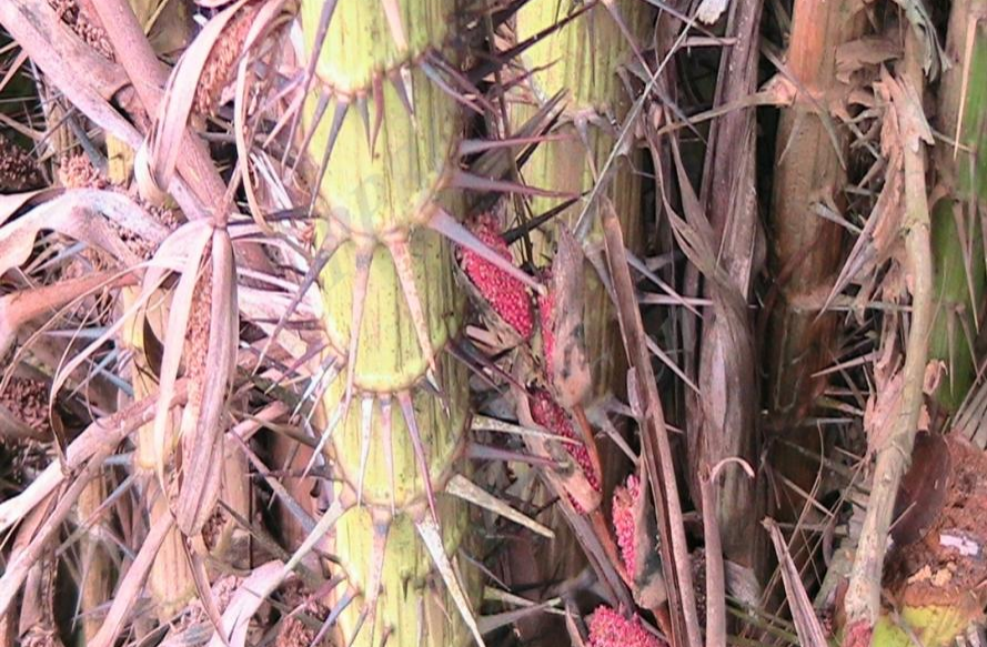 蛇皮果属于棕榈科,而棕榈科最有名的水果当属椰子,我们都知道椰子是长在树上的,那么蛇皮果会不会也是长在树上?实际上蛇皮果植株丛生开散,茎非常短,高度通常不超过50厘米,几乎紧贴着地面生长,但是它的叶子却非常长,成熟植株的叶长度可达6米,其中叶柄的长度就有2米,这些叶柄看上去像极了它的分枝,使得整个植株在外观上更像灌丛而非树木。?为了?;ぷ陨砻馐芏锏目惺?,蛇皮果植株的叶柄上还长满了又长又尖的刺,就连幼嫩的果实表面也覆盖着刺毛??。这种防御机制确保了蛇皮果能够在野外环境中安然生长。