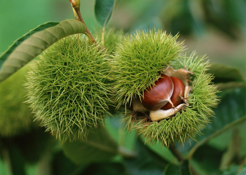 相信很多人都采摘过野板栗,其模样好似一只绿色的小刺猬。那是因为板栗除了有坚韧的硬壳外,还有一层密布尖刺的“壳斗”。这个“壳斗”其实是由总苞,也就是一类特殊的叶片发育而来的,里面包裹的每一个板栗,都是一个独立的小果子。成熟时,壳斗会十字而开,棕红色的栗子才会露出真身。也正因为板栗穿着布满尖刺的“外套”,才能更好地?;ぷ约旱墓?,让想吃它的动物,无从下嘴。不过,在很多人眼里板栗并不算坚果。因为坚果给人的印象是“香脆”,板栗却是“甜糯”。这是因为种子的脂肪含量越高,口感就越脆,而板栗富含淀粉,脂肪含量并不高。