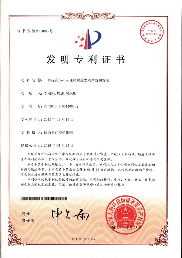 2015年1月13日,由陕西省西安植物园李淑娟、樊璐、吴永朋3名科研人员完成的“一种提高Lotos亚属睡莲繁殖系数的方法”获得了国家发明专利授权(专利号:ZL 2015 1 0014601.2)。