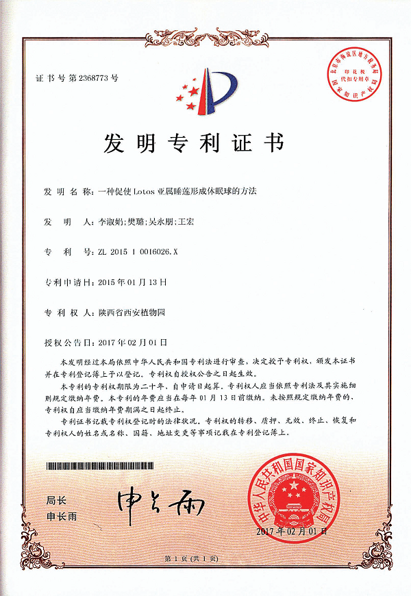 2015年1月13日,由陕西省西安植物园李淑娟、樊璐、吴永朋、王宏4名科研人员完成的“一种促使Lotos亚属睡莲形成休眠球的方法”获得了国家发明专利授权(专利号:ZL 2015 1 0016026.X)。