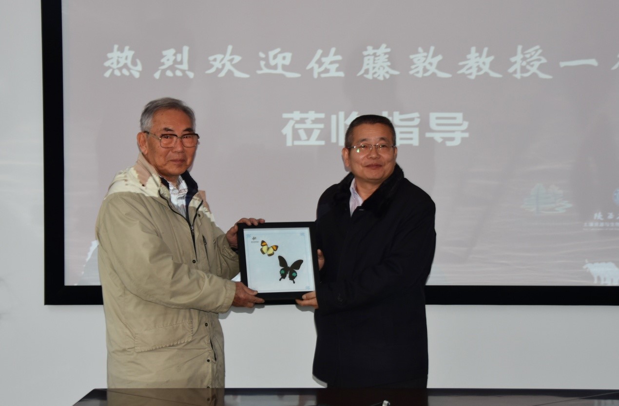 陕西省西安植物园主任岳明(右)向佐藤敦教授(左)赠送纪念品