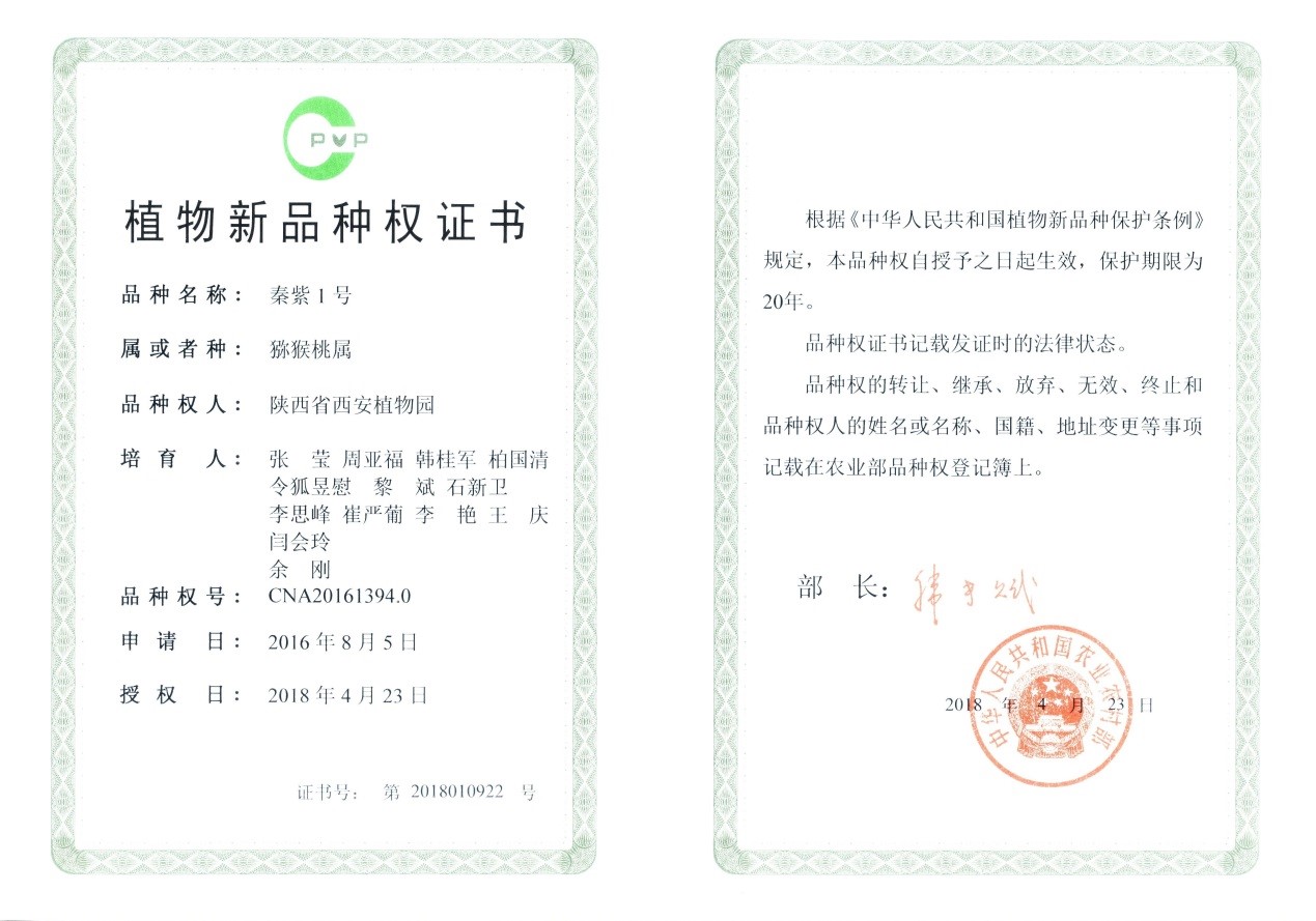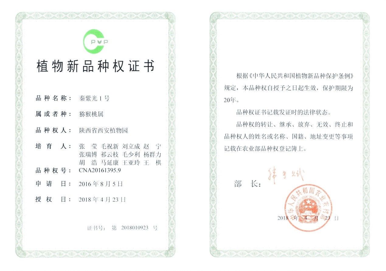 其中,两个紫果猕猴桃新品种“秦紫光1号”、“秦紫1号”于 2018年7月获中国农业农村部新品种授权(秦紫光1号品种权号:CNA 20161395.9;秦紫1号品种权号:CNA20161394.0)。两个新品种果皮均光滑无毛,不用剥皮,可直接鲜食,果实酸甜可口,风味独特,富含花青素,营养丰富,具抗癌潜力。已在山东淄博、陕西武功等地进行区域性试验,均取得良好效果。
