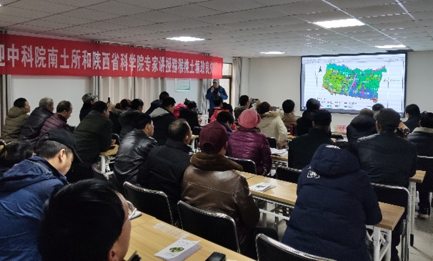 黄标研究员首先介绍了我园及合作单位开展陕西省特色农业土壤研究的状况及阶段性成果;随后于东升研究员作了“周至县北部种植区土壤资源质量与管理”、“周至县北部种植区土壤质量信息管理系统”相关技术报告,针对周至县猕猴桃主产区土壤质量现状与信息化管理方法做了详细介绍;最后李建刚副研究员作了“猕猴桃退化土壤营养生态调控技术规范”的培训报告,从果园土壤退化现实问题出发,分析土壤养分失衡原因,展示了土壤生态调控成效。