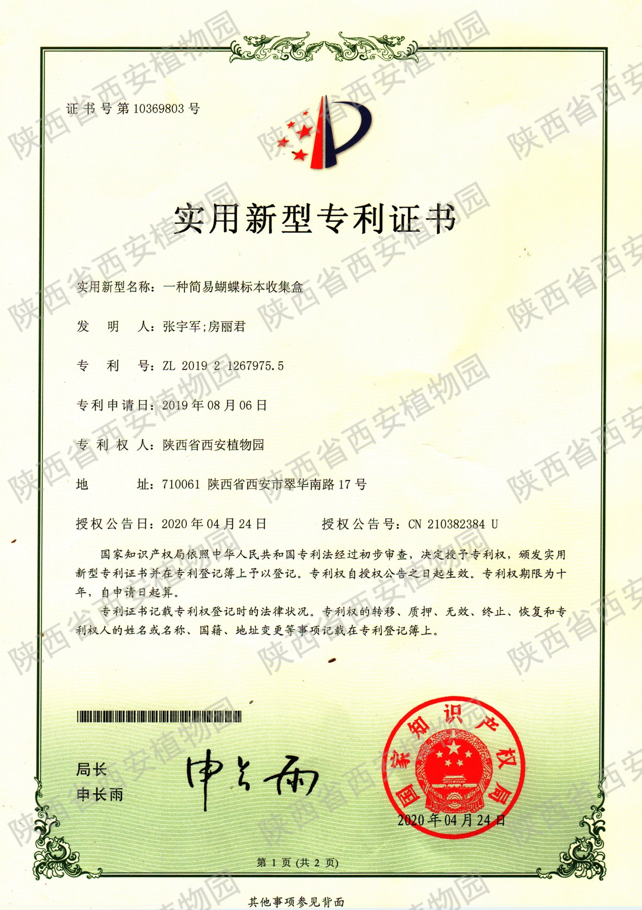 近日,由陕西省西安植物园张宇军、房丽君两位科研人员完成的 “一种简易蝴蝶标本收集盒”获得国家实用新型专利授权(专利号: ZL 2019 2 1267975.5)。