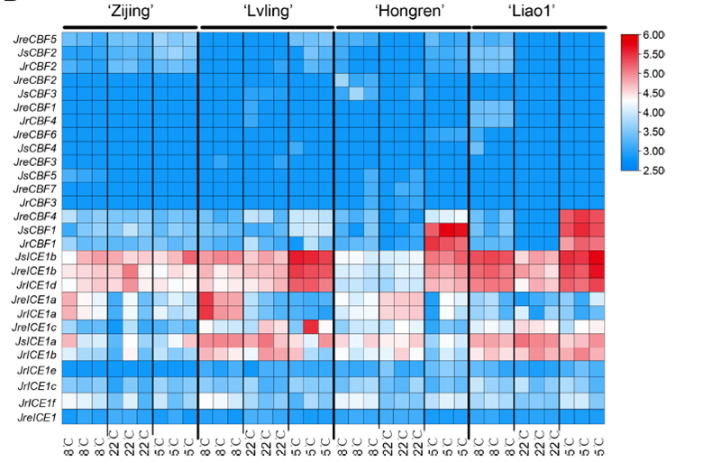 该研究利用“倒春寒”前后温度骤降时期,样品不同组织转录组测序,以核桃全基因组为参考,对不同核桃品种进行了抗冷??镃BF-ICE1-COR的生物信息学分析。包括转录因子数目、基因家族保守结构域、染色体定位、系统进化关系、保守基序、顺式调控元件和蛋白理化性质以及基因共线性等分析,发现三个核桃样品在基因家族数目、染色体分布等均存在差异。通过不同温度条件下转录组数据分析,发现ICE基因的表达量明显高于CBF基因,且在不同的品种中,其表达模式存在显著差异。