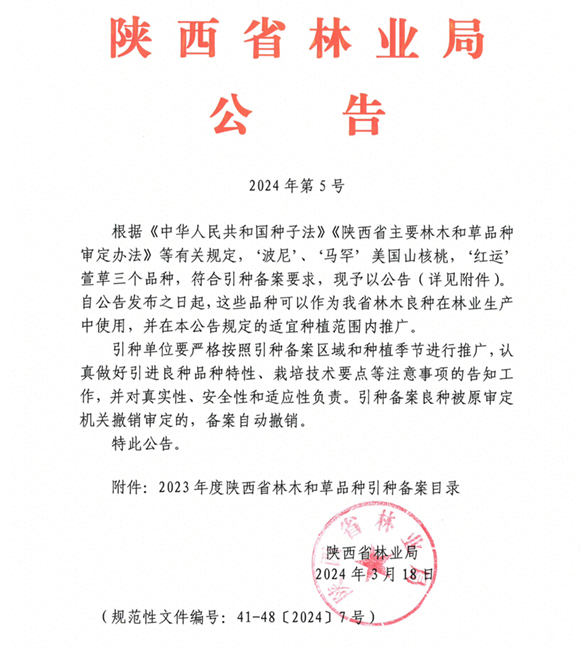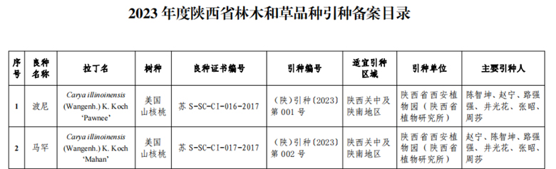 9.‘波尼’美国山核桃(Carya illinoinensis (Wangehn. ) K.Koch. ‘Pawnee’),该品种适应性、抗逆性较强,生长结实正常、大小年不明显,具有早实、稳产的优良特性,适宜引种区域为陕西关中及陕南地区。