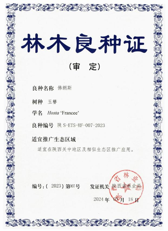 8.‘佛朗斯’玉簪(Hosta ‘Francee’),经引种选育而来。该品种株型高大,平均株高60 cm,丛幅90cm。叶阔卵状披针形,深绿色,边缘银白色,长13~22 cm,宽8~15 cm,叶柄长25~40 cm?;ㄜ鸫肿持绷ⅲ躺?,高65~100 cm,花序长 22~40 cm,小花26~36朵,漏斗形,淡紫色,花期6~7月。该品种适应性强,有较强抗病虫性。适宜在陕西关中地区及相似生态区推广应用。