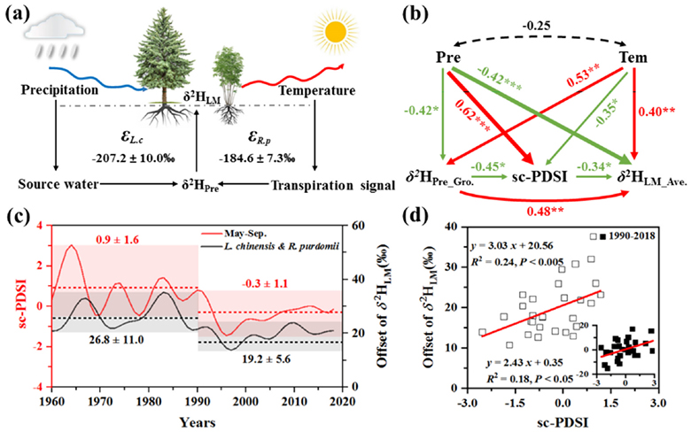 上述研究成果以“Warming and drying increased the interspecies consistency of tree-ring lignin methoxy δ2H variability at the alpine treeline”为题,近日发表于国际地学综合期刊Global and Planetary Change(中科院一区TOP期刊,IF=4.0),西安植物园为第一署名单位,路强强博士为第一作者,陕西师范大学刘晓宏教授为通讯作者。该研究获国家自然科学基金委(42301053)、陕西省科技厅(2024ZC-KJXX-099)和陕西省科学院(2023k-08)等项目资助。特色农业与环境植物学团队、西北大学、陕西省气象台、太白山国家级自然?;で芾砭帧⒅泄蒲г何鞅鄙肪匙试囱芯吭?、秦岭国家植物园等相关人员参与了本研究工作。