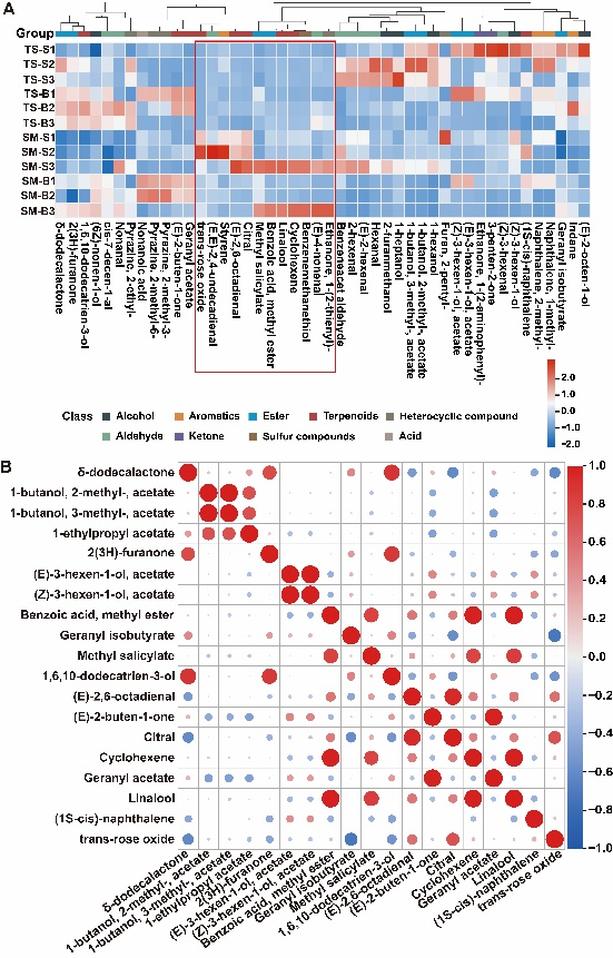 本研究分别以玫瑰香型‘阳光玫瑰’和无香型‘无核白’果实发育的三个时期(幼果期、果实软化期和成熟期)的果皮和果肉为材料,通过GC-MS挥发性代谢组共测定了381种差异代谢物在两种葡萄中差异积累,根据相对气味活性值(rOAVs)筛选出46种挥发性差异化合物对‘阳光玫瑰’葡萄的特征香味有直接贡献,酯类、萜类和醛类为主要组分。对46种差异化合物进行相关性分析,芳樟醇、萜品油烯、水杨酸甲酯和苯甲酸甲酯之间呈极显著相关。