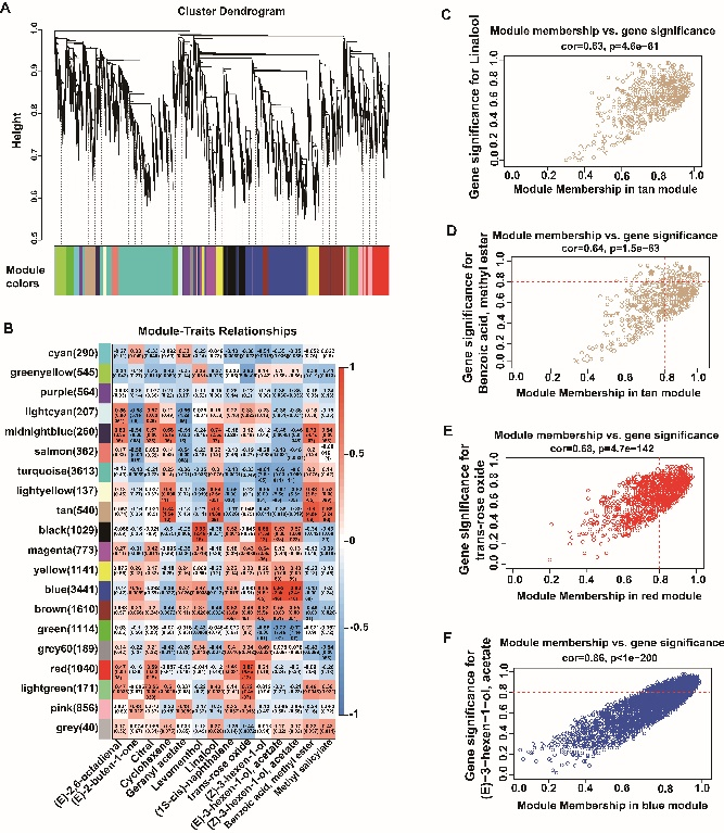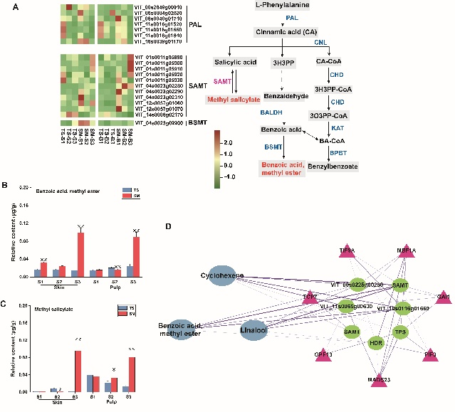 通过转录组学筛选出萜类骨架和苯丙烷生物合成通路中的基因差异表达。WGCNA分析芳樟醇、萜品油烯、水杨酸甲酯和苯甲酸甲酯与tan??橹械牟钜旎蚬脖泶?,在该模块中建立了芳樟醇、萜品油烯和苯甲酸甲酯与代谢物合成关键基因HDR和SAMT及转录因子共表达网络图。已有报道发现芳樟醇和玫瑰氧化物等单萜化合物是玫瑰香型葡萄特征香味物质,本研究进一步补充了酯类水杨酸甲酯和苯甲酸甲酯与单萜类芳樟醇协同积累形成葡萄的玫瑰香味。本研究为香味葡萄风味形成机理奠定了理论基础。