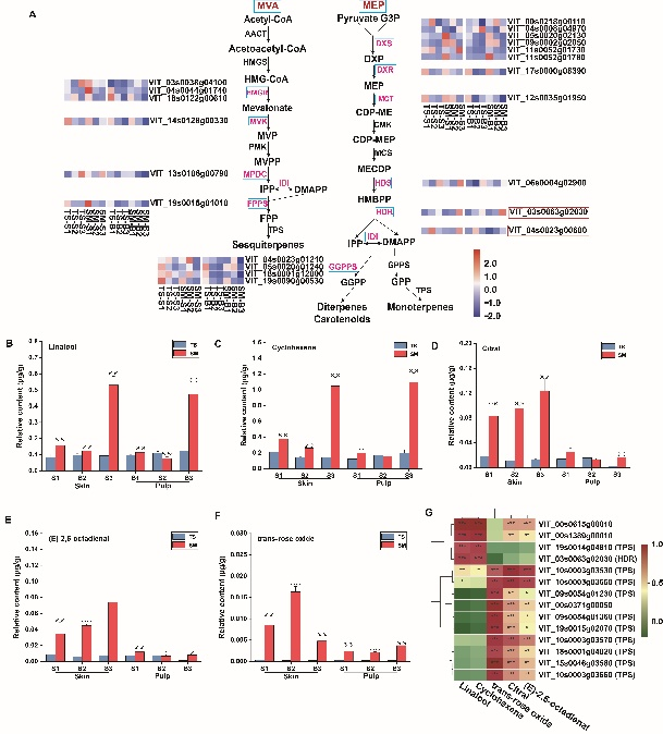 葡萄是世界范围内重要的栽培果树之一,因其独特的风味和较高的营养价值受到消费者的喜爱。宜人的葡萄风味让人感到喜悦,给人留下深刻的印象,也是鲜食葡萄的重要性状,决定了葡萄的品质。葡萄的风味由糖、酸、挥发性和非挥发性化合物等物质形成。玫瑰香型葡萄的香味主要由挥发性化合物组成,包括萜类、酯类、醇类、醛类和挥发性酸类等。