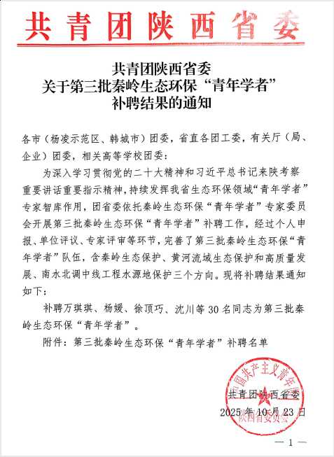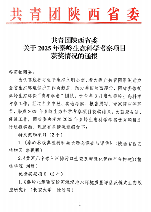 近日,共青团陕西省委通报了2025年秦岭生态科学考察项目的评审获奖情况,陕西省西安植物园路强强博士申报完成的“秦岭林线典型树种生长动态调查与评估”获特别奖励。秦岭生态科学考察项目是为认真践行习近平生态文明思想和历次来陕考察重要讲话重要指示精神,着力提升共青团组织助力美丽陕西建设而设立,团省委依托秦岭生态环?!扒嗄暄д摺蓖哦?,经自主申报、实地考察、报告撰写、现场答辩、专家评审等环节,形成优秀项目获奖结果。