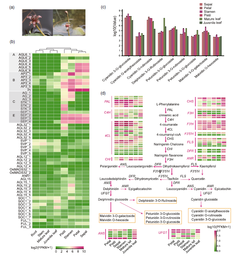 ·?花部同源演化:?针对莼菜花器官(萼片、花瓣、雄蕊、雌蕊)颜色均一的特征,研究发现花青素合成基因(如CHS、DFR)及MADS-box基因在各器官中均维持高表达。这一结果支持了“花部同源演化”假说,证明莼菜保留了早期被子植物花器官分化前的原始状态。