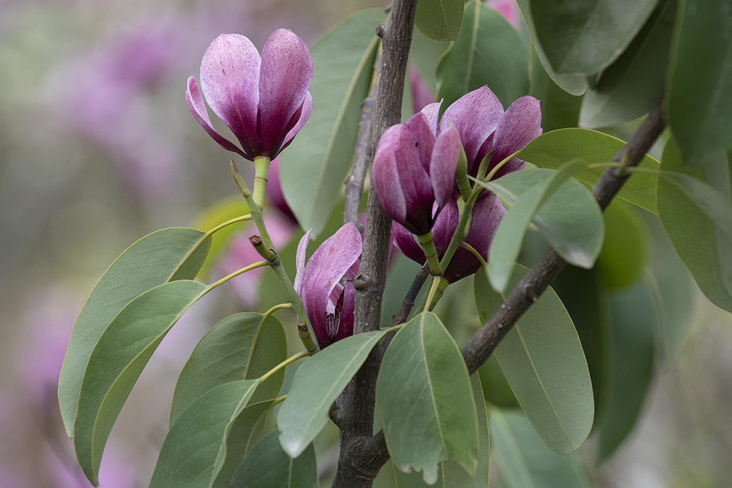 形态特征: 常绿小乔或灌木,树皮浅灰色或灰褐色。叶革质,长圆状椭圆形,很少卵状椭圆形,先端骤狭短渐尖或短渐尖而尖头钝,基部楔形、阔楔形或近圆钝?;üB躺?环状苞片脱落痕,佛焰苞状苞片淡褐色,薄革质;花芳香,花被片7-9片,上部带淡红色,下部深紫红色,外轮呈倒卵形,内两轮则渐狭?。唤仔?,顶端尖;雄蕊深紫红色。心皮连柱头紫红色,聚合果,花期2-4月。果期9-10月。