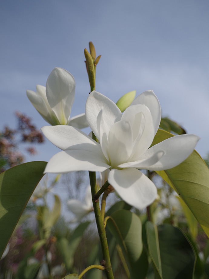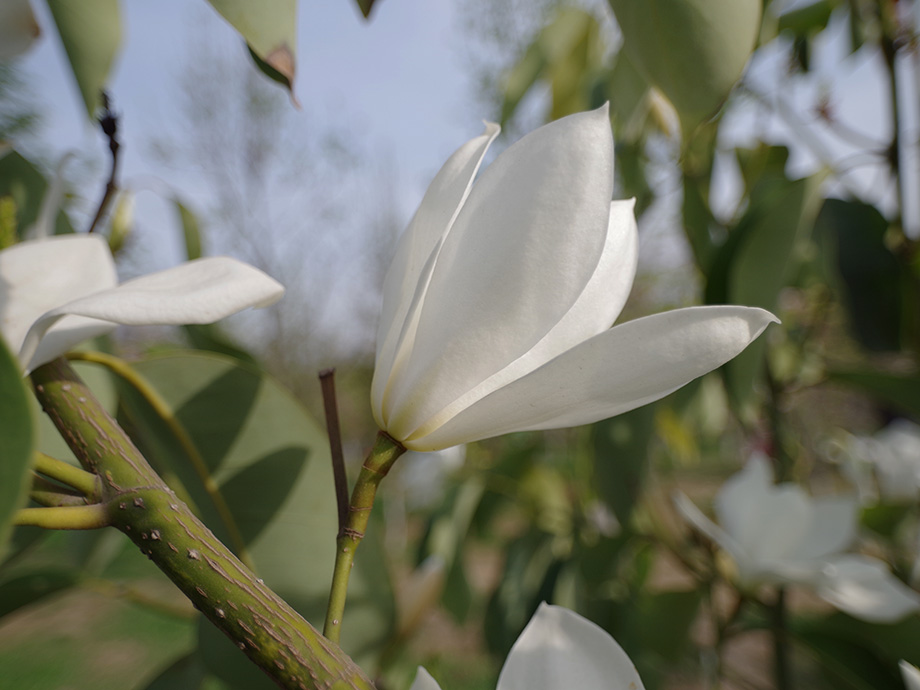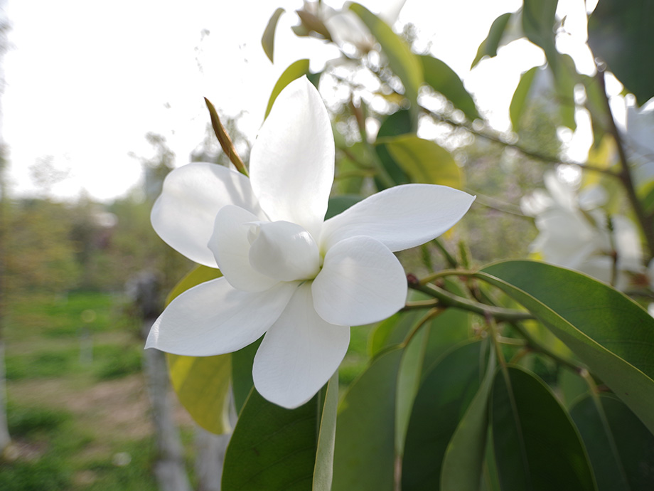 形态特征: 常绿小乔木或大灌木,树皮灰褐色,分枝繁密,树冠成形快叶革质,狭椭圆形或倒卵状椭圆形,花朵纯白,花大,花径达10cm,香味浓郁。主花期春、秋两季,3月份开花最盛,秋季花期由夏季延续,直至11月底;而初冬时又见其陆续开花,直至冬末。果期8-9月。