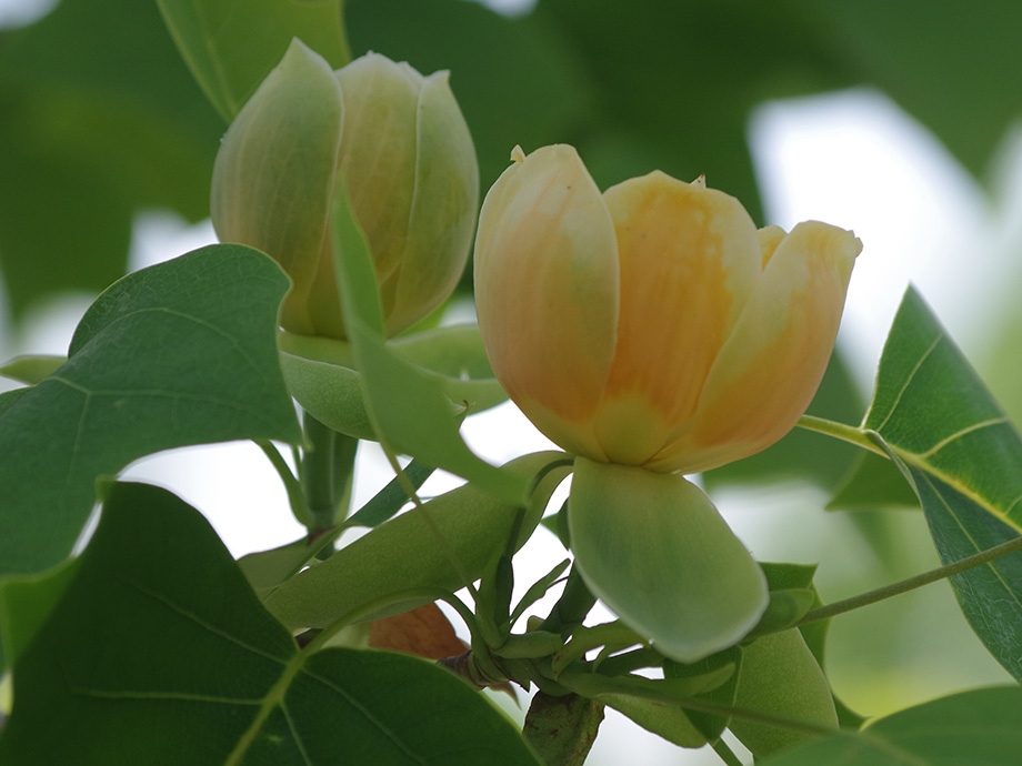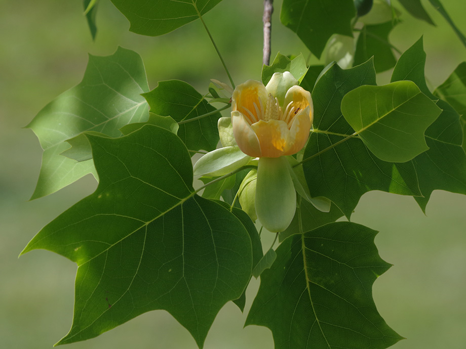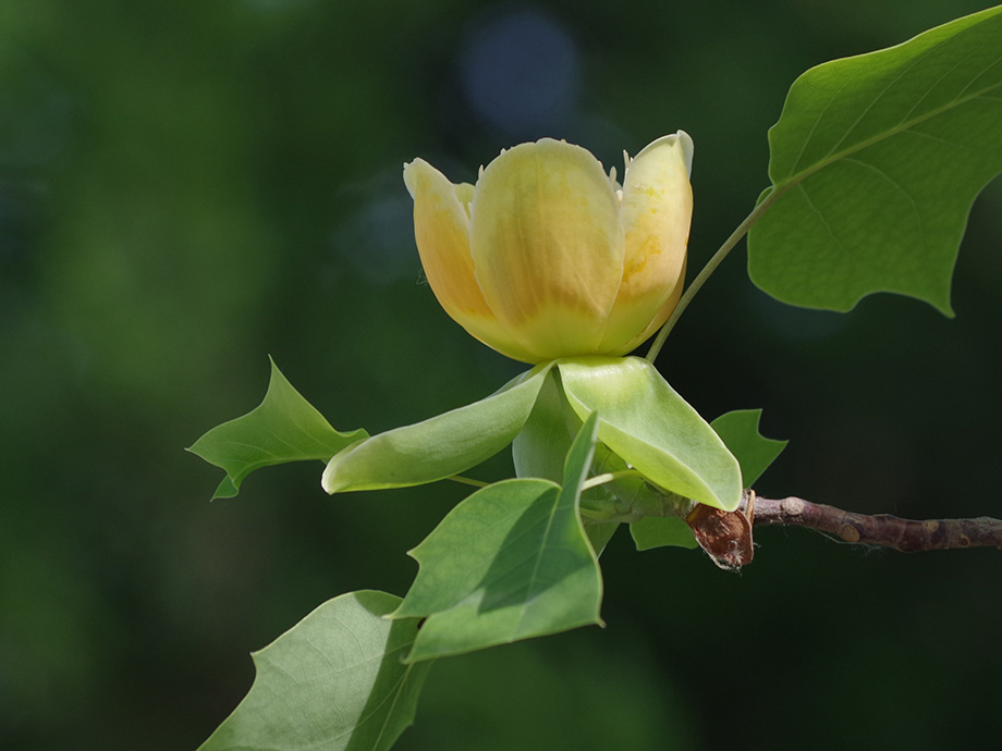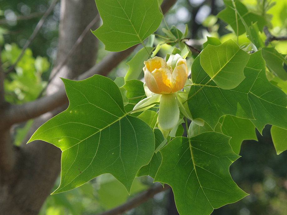 形态特征: 落叶大乔木,树皮灰色,一年生枝灰色或灰褐色,具环状托叶痕。单叶互生,叶两侧通常各1裂,向中部凹,形似马褂;叶柄长。4-5月开花,花较大,鹅黄色,花形杯状,单生枝顶。10月果熟,果实纺锤状。