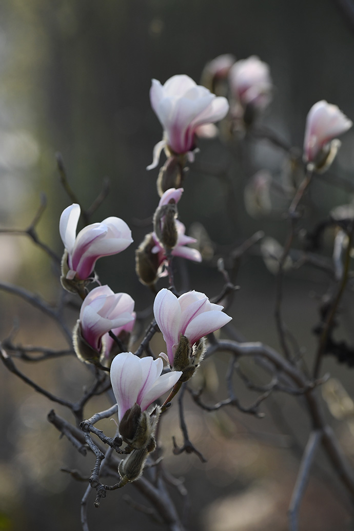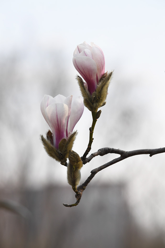 形态特征: 落叶乔木;树皮淡灰色,光滑;小枝细长,灰绿色;顶芽卵圆形或宽卵圆形,密被淡黄色展开长柔毛。叶椭圆状披针形、卵状披针形,狭倒卵或卵形,先端急尖,或短渐尖,基部阔楔形,或圆钝,边缘干膜质,下延至叶柄,上面暗绿色,下面浅绿色,初被平伏棉毛,后无毛?;ㄏ纫犊牛本?-8厘米,芳香;花被9,外轮3片紫红色,近狭倒卵状条形,中内两轮近匙形,白色,外面基部常紫红色,内轮的较狭小。聚合果圆柱形,常因部分不育而扭曲。