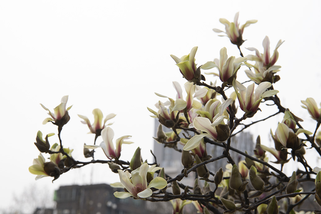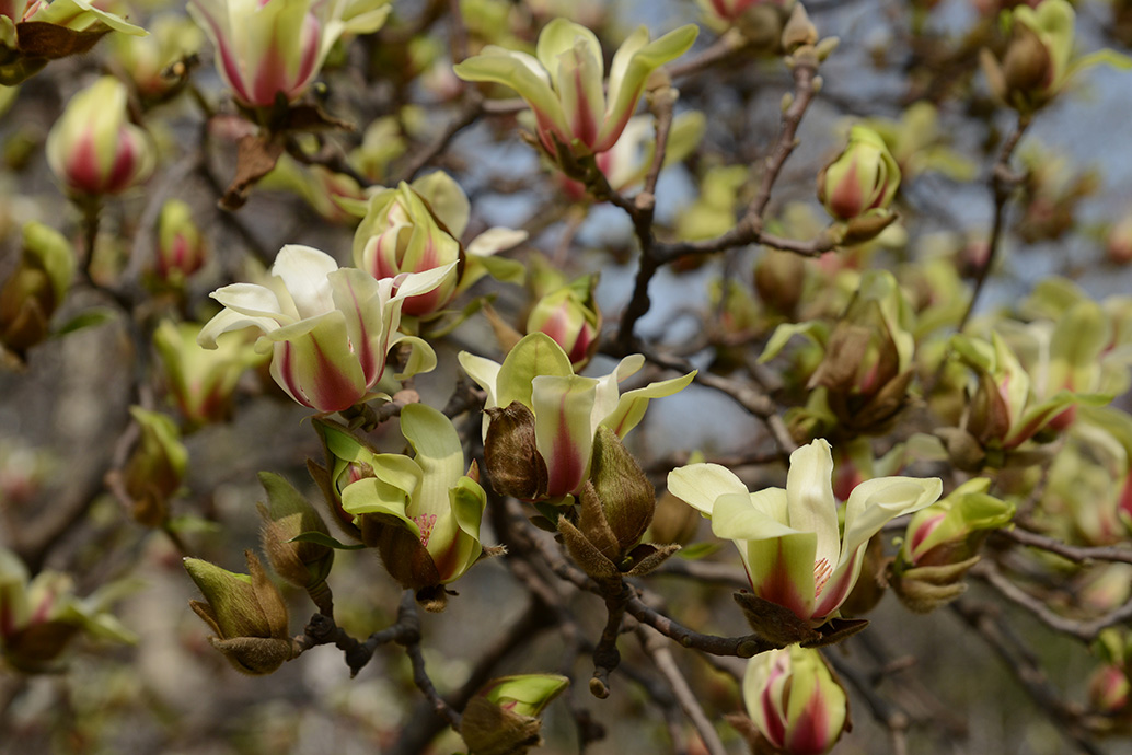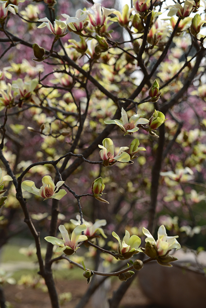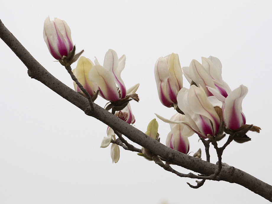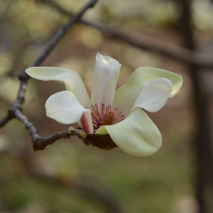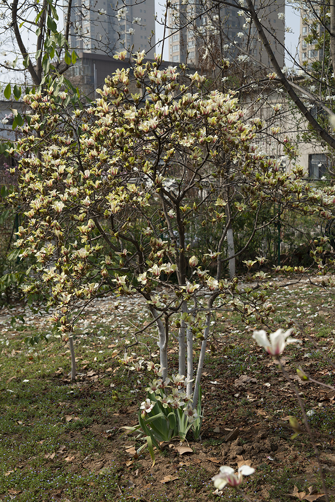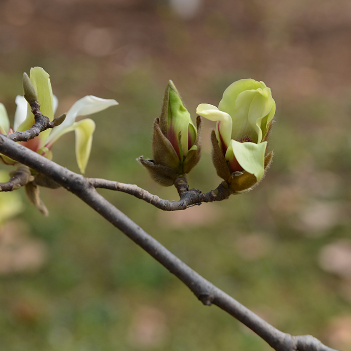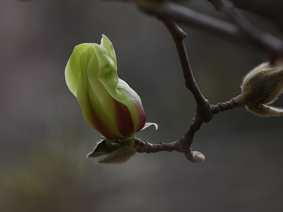 形态特征: 落叶矮化小乔木,是美丽紫玉兰的芽变品种,四年生植株高度仅1.5~2 m;芽、叶柄、叶背、花蕾、花梗均被白色平伏柔毛;叶纸质,长椭圆形或倒卵状长椭圆形,长8~14 cm,宽3~5 cm,顶端钝圆或具短凸尖,基部楔形;花芳香,花被片9,外轮3片萼片状,三角形或舌形,绿色,内2轮肉质,倒卵状椭圆形或倒卵状匙形;初开内外均为绿色,后内外均为白色,外面基部约1/3处紫红色,具紫红色脉纹;蓇葖果圆柱体形,成熟时紫红色,花期3下旬至4月上旬,果熟期8月下旬。