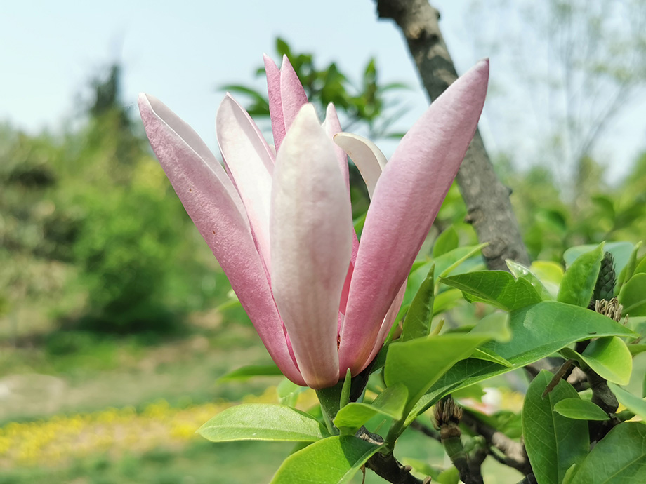 形态特征: 半常绿小灌木。株型紧凑,枝叶密集。叶倒卵状长椭圆形,先端渐尖、短尾尖,小叶上面深绿色,沿脉具白色短柔毛;叶背绿色,密被白色平伏短柔毛;叶柄密被白色平伏短毛,叶片基部略下沿。花顶生;杯状,花被片直立,盛开时,花被片外张但不平展,径8-9cm;花被片倒卵状条形,质地厚,纵向略内卷,内外几同形、近等长;背面红色至粉红色,先端色略浅,向基部色深,腹面浅粉红色;花被片9(-10)?;ㄆ?月初-6月初,6月下旬第二次开花,零星开花至8月下旬。未见结实。