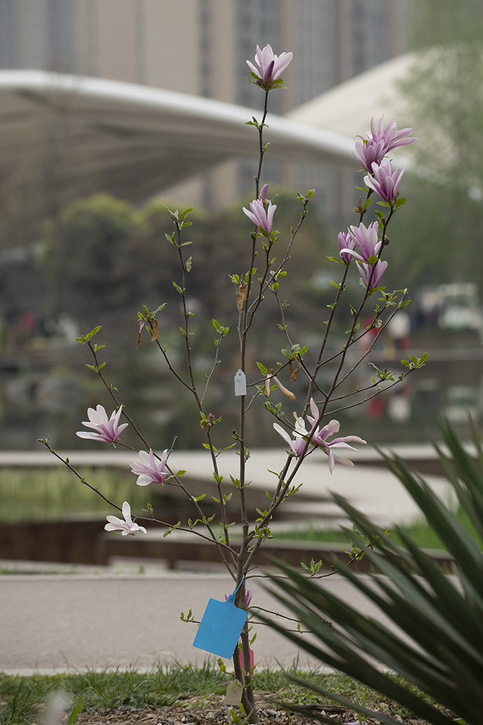 形态特征: 落叶小灌木,叶纸质,倒卵状椭圆形、倒卵状狭椭圆形、狭椭圆形,先端渐尖、尾尖,基部楔形,叶面不平,边缘略波状;花蕾顶生,佛焰苞密被浅黄色短绒毛;花盛开如莲状,紫红色,基部颜色略深?;ㄆ?月下旬~4月上中旬。三倍体,无果实。 来源: 西安植物园自育杂交栽培品种(品种权号20210221)