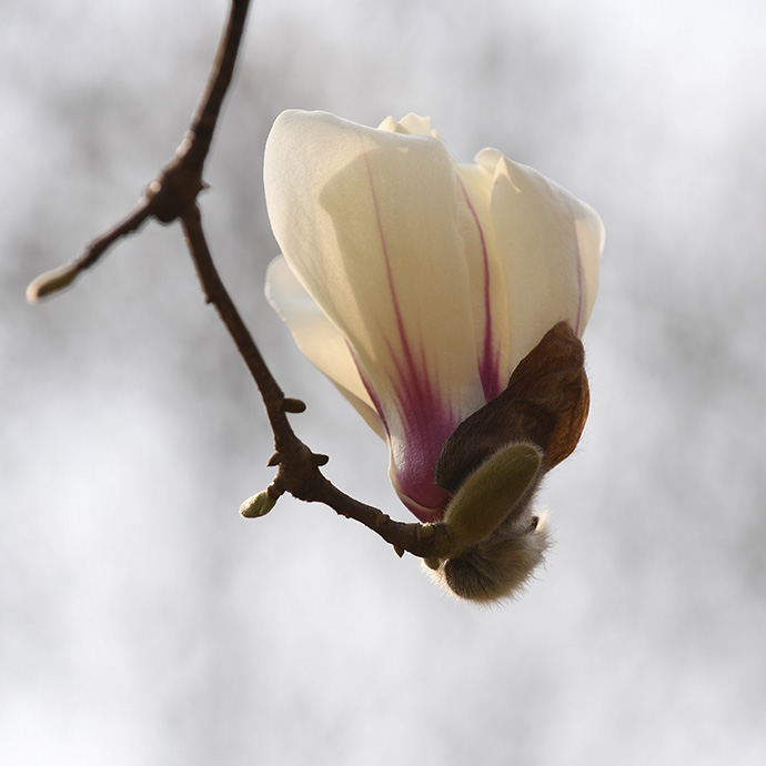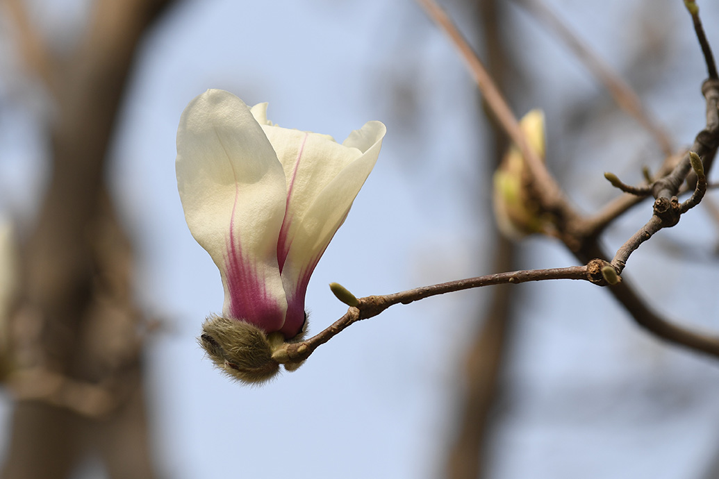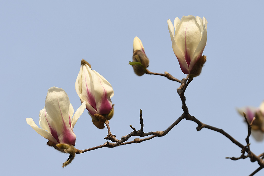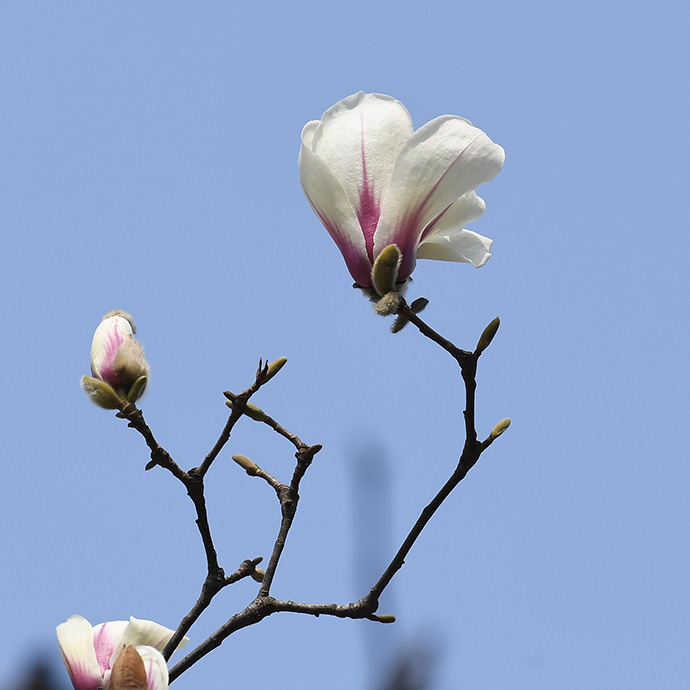 形态特征: 落叶乔木,高达11米,胸径达30厘米,树皮灰白色,平滑。嫩枝绿色,无毛,老枝紫色,疏生皮孔;芽狭卵形,顶端稍弯,被长绢毛。叶膜质,倒卵状长圆形或长圆形,先端宽圆具渐尖头,基部阔楔形或圆钝,上面绿色,无毛,下面淡绿色,中脉及侧脉有长弯曲毛,初被长柔毛。花蕾卵形,花先叶开放,有芳香,直径约12cm;花被片9,近匙形,先端圆或稍尖,内轮较狭小,白色,背面中部以下淡紫红色,上部白色。聚合果圆柱形,成熟蓇葖近圆形?;ㄆ?-4月,果期8-9月。 原产: 江苏宝华山 植物类型:乔木 高度:8-11m 冠幅:3-4m 适生范围:7-9区 需光性:喜阳 花色:白色 花期:3-4月 特点:花期长,花大芳香,适应性强。 土壤PH值:弱酸、中性和弱碱土壤皆可 繁殖方式:播种,嫁接。