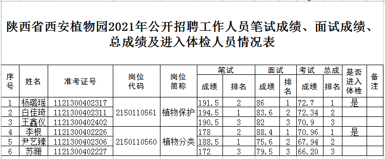 附件:陕西省西安植物园2021年公开招聘工作人员笔试成绩、面试成绩、总成绩及进入体检人员情况表