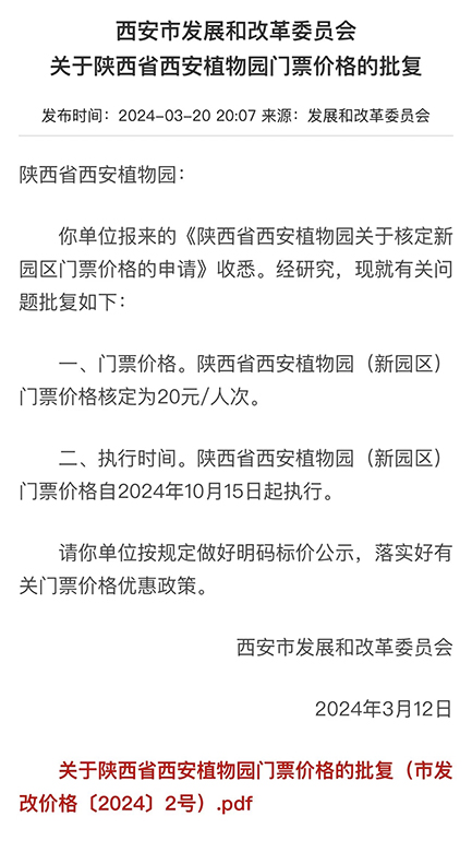 关于陕西省西安植物园门票价格的批复(市发改价格〔2024〕2号)